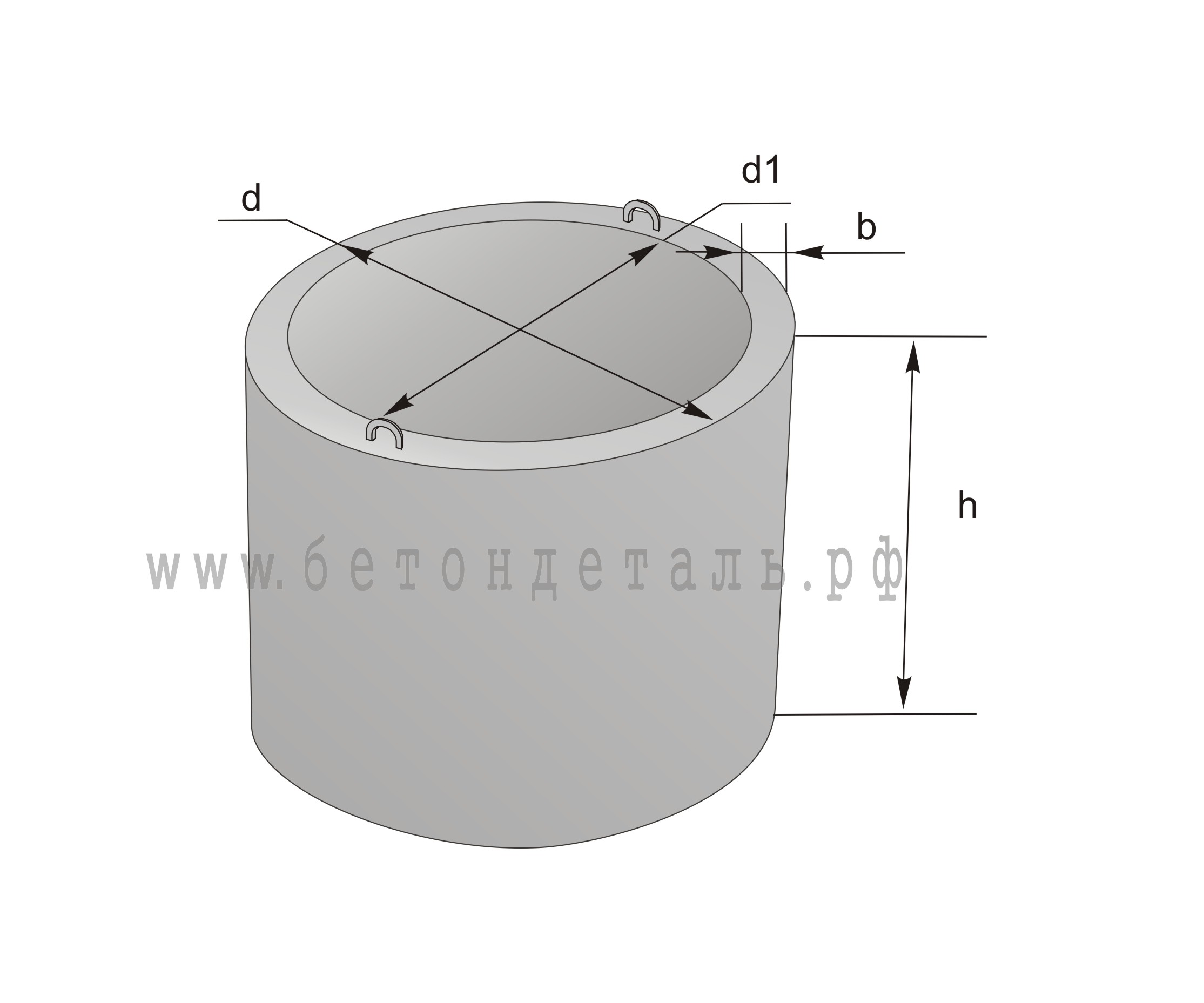 Маркировка железобетонных колец для колодцев представляет собой цифробуквенный набор, который включает в себя условные обозначения наименование изделия, внутренний диаметр кольца и высоту кольца в дециметрах.