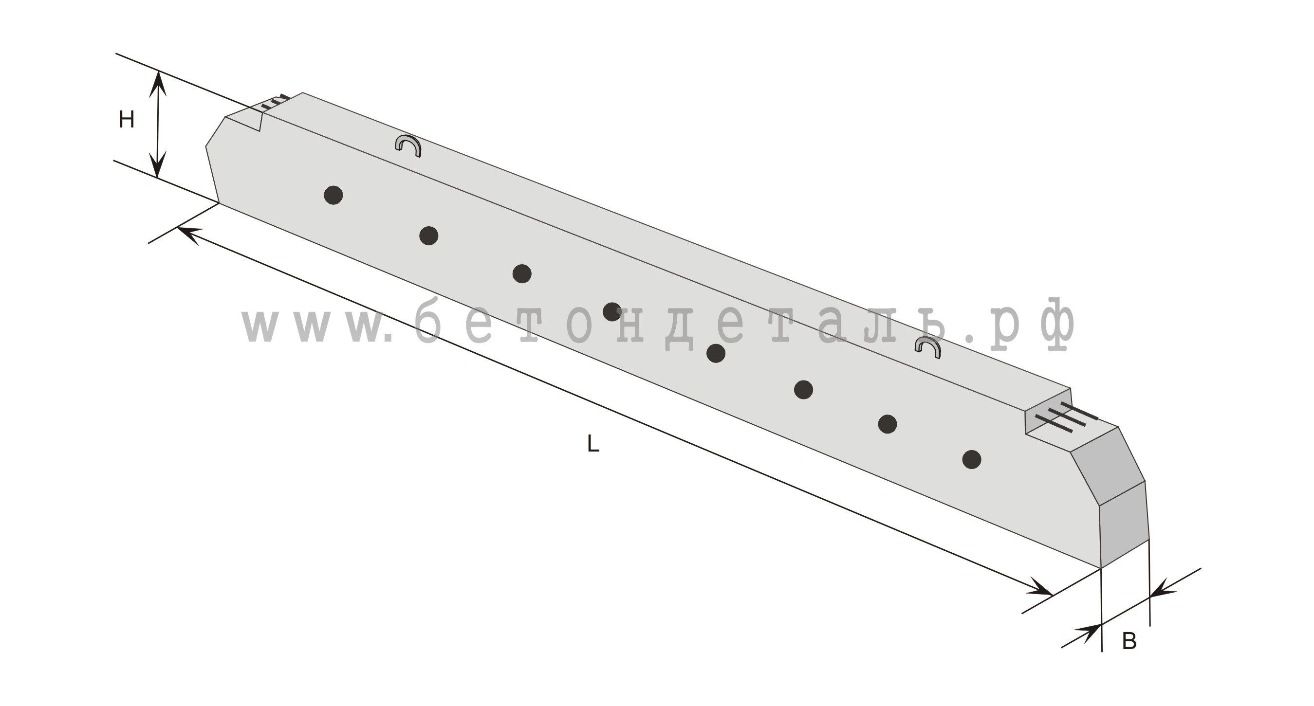 В процессе изготовления ригелей ИБ 7 применяется тяжелый бетон марок М200-М300. Бетон двухполочного ригеля ИБ 7 обладает высокими качественными характеристиками по жесткости и прочности, трещиностойкости, морозостойкости (не ниже F100) и огнестойкости, а также водонепроницаемости. Так как ригели являются основными составляющими в каркасе сооружения, для еще большей прочности изделие армируется пространственными арматурными каркасами, сетками и закладными деталями, объединенные с помощью дуговой или контактной сварки. Напряженная арматура изготавливается из стали класса А-III и А-Шв и проволоки класса В-I. Предел огнестойкости ригелей составляет 2 часа. Масса ригеля составляет 4000 кг. Конструкцией ригеля предусмотрено наличие строповочных отверстий, которые предназначены для облегчения процесса разгрузки и погрузки. Железобетонные ригели ИБ 7- это высококачественное изделия, которое, при соблюдении всех технологических норм, способно прослужить не один десяток лет.
